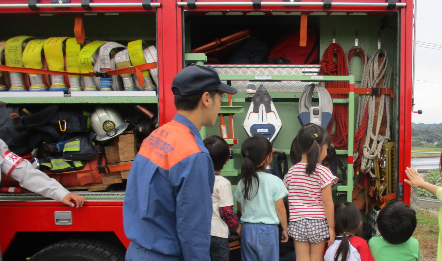2023.11.16 日記 避難訓練 日置市の消防署の方においでいただき、火災を想定した 避難訓練を実施しました! 訓練の後は、消火器の使い方を教えてもらったり、 消防車や救急車を実際見せていただく事が出来ました!! 子ども達、大喜び(*^_^*) 「これは何ですか」とたくさん質問して、目をキラキラさせて 消防車に夢中になっていました(^-^)